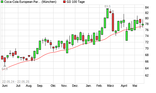 Mit dem Rücksetzer auf 76,90 EUR hat die Coca-Cola Europacific Partners-Aktie am 21.05.2025 die 100-Tage-Linie nach unten gekreuzt.