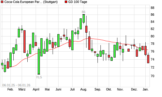 Mit dem Rücksetzer auf 74,60 EUR hat die Coca-Cola Europacific Partners-Aktie am 05.01.2026 die 100-Tage-Linie nach unten gekreuzt.