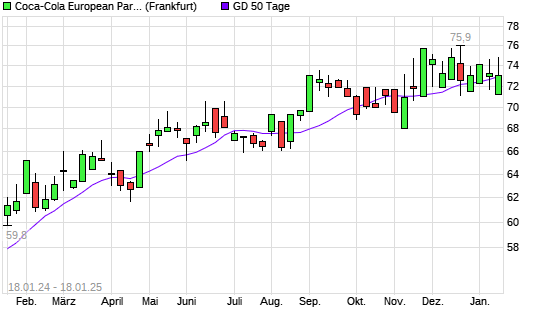 Mit dem Rücksetzer auf 73,00 EUR hat die Coca-Cola Europacific Partners-Aktie am 17.01.2025 die 50-Tage-Linie nach unten gekreuzt.