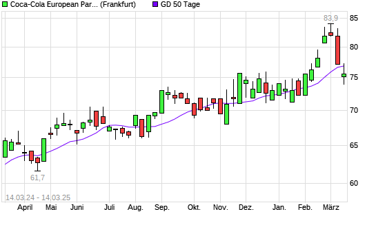 Mit dem Rücksetzer auf 75,40 EUR hat die Coca-Cola Europacific Partners-Aktie am 13.03.2025 die 50-Tage-Linie nach unten gekreuzt.