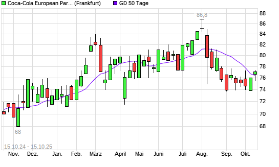 Mit dem Rücksetzer auf 75,50 EUR hat die Coca-Cola Europacific Partners-Aktie am 14.10.2025 die 50-Tage-Linie nach unten gekreuzt.