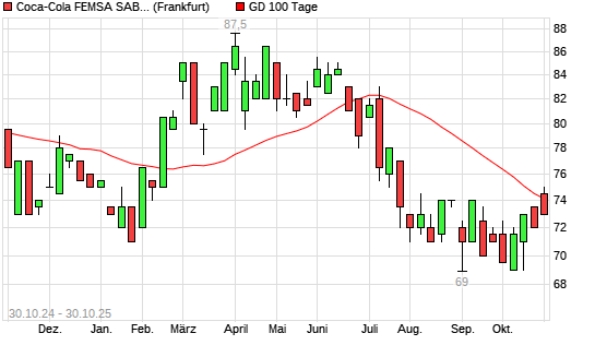 Mit dem Rücksetzer auf 74,00 EUR hat die Coca-Cola Femsa ADR-Aktie am 29.10.2025 die 100-Tage-Linie nach unten gekreuzt.