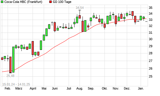 Mit dem Rücksetzer auf 32,72 EUR hat die Coca-Cola HBC-Aktie am 13.01.2025 die 100-Tage-Linie nach unten gekreuzt.