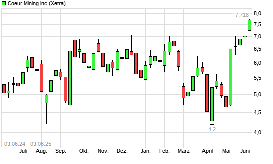 Mit dem Anstieg auf 7,50 EUR hat die Coeur Mining-Aktie (ISIN US1921085049) am 02.06.2025 ein neues 3-Jahres-Hoch erreicht und damit den Kurs vom 28.05.2025 eingestellt.
