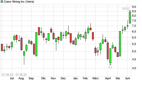 Mit dem Anstieg auf 8,45 EUR hat die Coeur Mining-Aktie (ISIN US1921085049) am 06.06.2025 ein neues 3-Jahres-Hoch erreicht und damit den Kurs vom 05.06.2025 eingestellt.