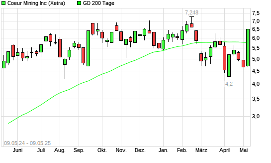 Mit dem Anstieg auf 6,14 EUR hat die Coeur Mining-Aktie am 08.05.2025 die 200-Tage-Linie nach oben gekreuzt.