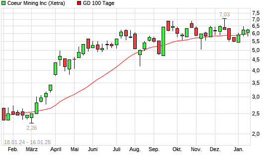 Mit dem Rücksetzer auf 5,88 EUR hat die Coeur Mining-Aktie am 17.01.2025 die 100-Tage-Linie nach unten gekreuzt.