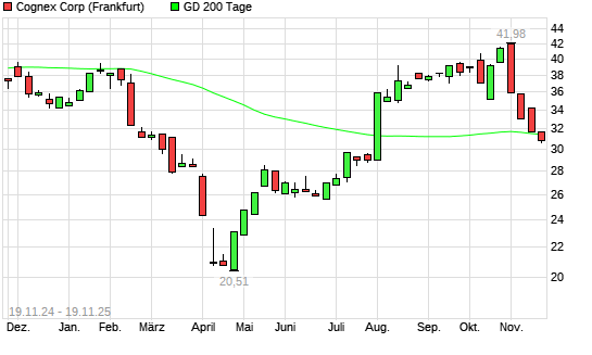Mit dem Rücksetzer auf 31,00 EUR hat die Cognex-Aktie am 18.11.2025 die 200-Tage-Linie nach unten gekreuzt.