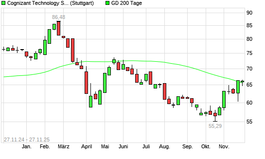 Mit dem Anstieg auf 66,04 EUR hat die Cognizant-Aktie am 26.11.2025 die 200-Tage-Linie nach oben gekreuzt.