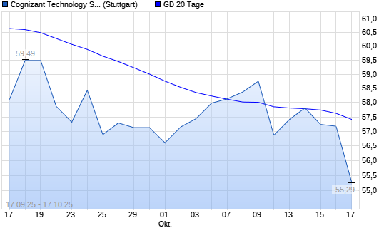 Mit dem Rücksetzer auf 57,11 EUR hat die Cognizant-Aktie am 16.10.2025 die 20-Tage-Linie nach unten gekreuzt.