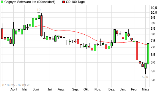 Mit dem Rücksetzer auf 7,05 EUR hat die Cognyte Software-Aktie am 06.03.2026 die 100-Tage-Linie nach unten gekreuzt.