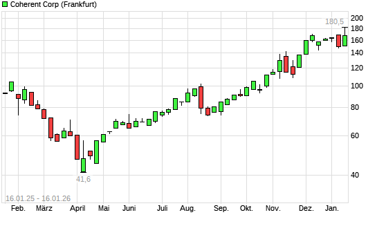 Mit dem Anstieg auf 171,50 EUR hat die Coherent-Aktie (ISIN US19247G1076) am 15.01.2026 ein neues All-Time-High erreicht und damit den Kurs vom 11.12.2025 eingestellt.