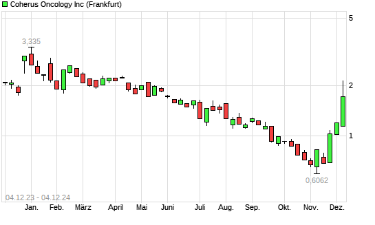Mit dem Anstieg auf 2,00 EUR hat die Coherus Biosciences-Aktie (ISIN US19249H1032) am 03.12.2024 ein neues 6-Monats-Hoch erreicht und damit den Kurs vom 13.06.2024 eingestellt.