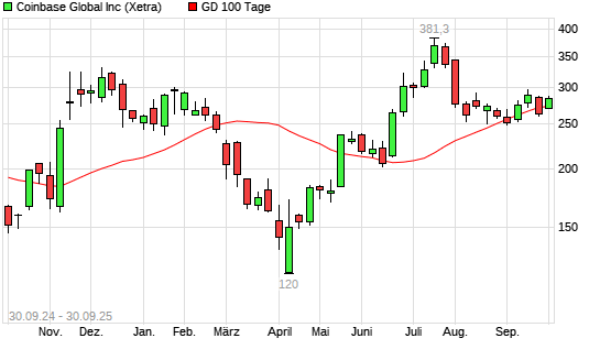 Mit dem Anstieg auf 284,35 EUR hat die Coinbase-Aktie am 29.09.2025 die 100-Tage-Linie nach oben gekreuzt.