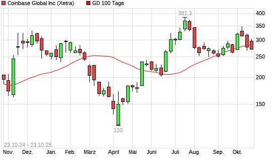 Mit dem Rücksetzer auf 269,75 EUR hat die Coinbase-Aktie am 22.10.2025 die 100-Tage-Linie nach unten gekreuzt.