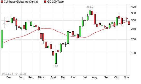 Mit dem Rücksetzer auf 289,05 EUR hat die Coinbase-Aktie am 03.11.2025 die 100-Tage-Linie nach unten gekreuzt.
