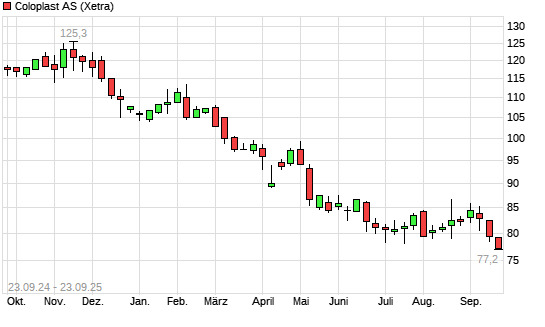 Mit dem Rücksetzer auf 77,96 EUR hat die Coloplast-Aktie (ISIN DK0060448595) am 22.09.2025 ein neues 5-Jahres-Tief erreicht und damit den Kurs vom 19.08.2025 eingestellt.