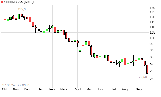 Mit dem Rücksetzer auf 73,80 EUR hat die Coloplast-Aktie (ISIN DK0060448595) am 26.09.2025 ein neues 5-Jahres-Tief erreicht und damit den Kurs vom 25.09.2025 eingestellt.