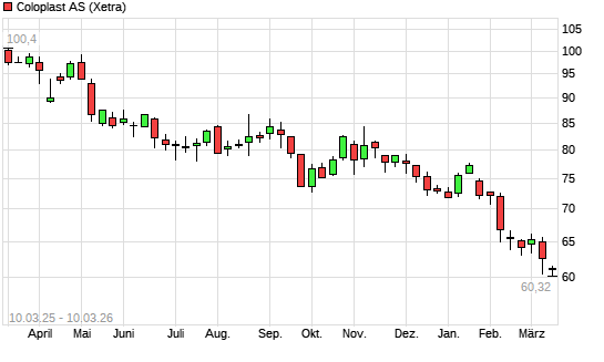 Mit dem Rücksetzer auf 60,56 EUR hat die Coloplast-Aktie (ISIN DK0060448595) am 09.03.2026 ein neues 5-Jahres-Tief erreicht und damit den Kurs vom 05.03.2026 eingestellt.