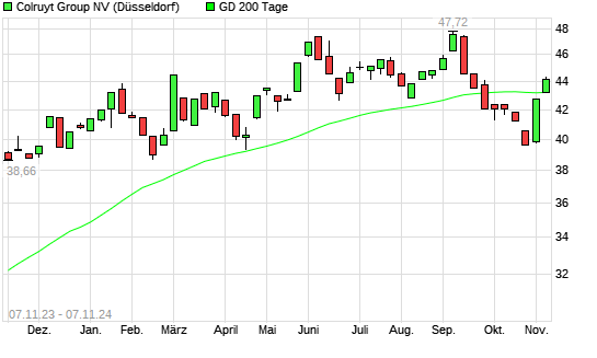 Mit dem Anstieg auf 44,10 EUR hat die Colruyt-Aktie am 06.11.2024 die 200-Tage-Linie nach oben gekreuzt.