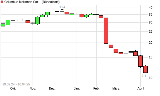 Mit dem Rücksetzer auf 11,40 EUR hat die Columbus McKinnon-Aktie (ISIN US1993331057) am 09.04.2025 ein neues 10-Jahres-Tief erreicht und damit den Kurs vom 10.02.2016 eingestellt.