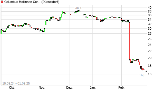 Mit dem Rücksetzer auf 16,70 EUR hat die Columbus McKinnon-Aktie (ISIN US1993331057) am 28.02.2025 ein neues 5-Jahres-Tief erreicht und damit den Kurs vom 27.02.2025 eingestellt.