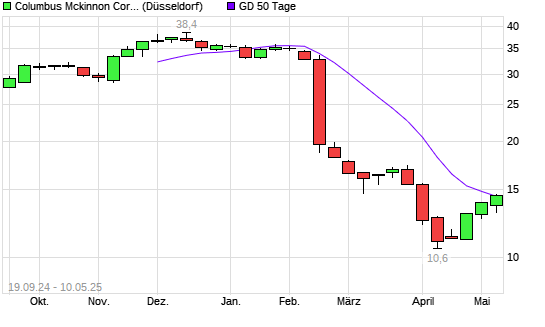 Mit dem Anstieg auf 14,60 EUR hat die Columbus McKinnon-Aktie am 09.05.2025 die 50-Tage-Linie nach oben gekreuzt.