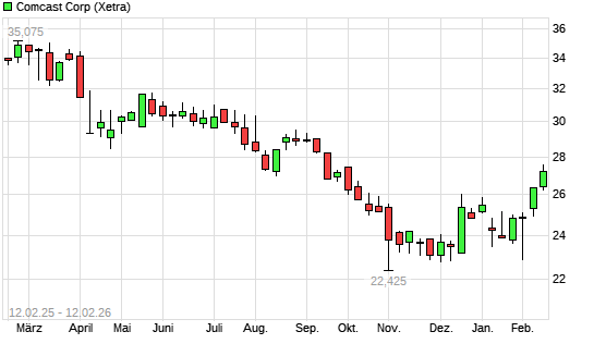 Mit dem Anstieg auf 27,35 EUR hat die Comcast-Aktie (ISIN US20030N1019) am 11.02.2026 ein neues 6-Monats-Hoch erreicht und damit den Kurs vom 02.09.2025 eingestellt.
