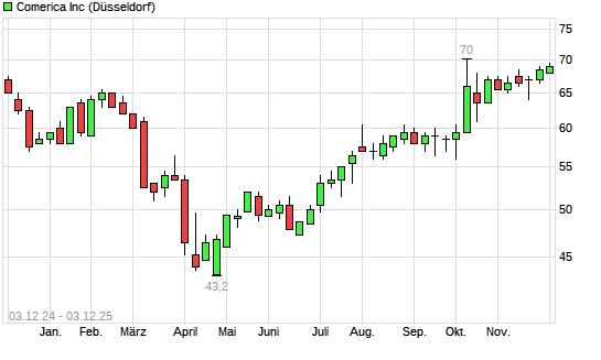 Mit dem Anstieg auf 69,50 EUR hat die Comerica-Aktie (ISIN US2003401070) am 02.12.2025 ein neues 12-Monats-Hoch erreicht und damit den Kurs vom 10.10.2025 eingestellt.