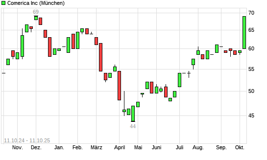 Mit dem Anstieg auf 69,00 EUR hat die Comerica-Aktie (ISIN US2003401070) am 10.10.2025 ein neues 6-Monats-Hoch erreicht und damit den Kurs vom 09.10.2025 eingestellt.