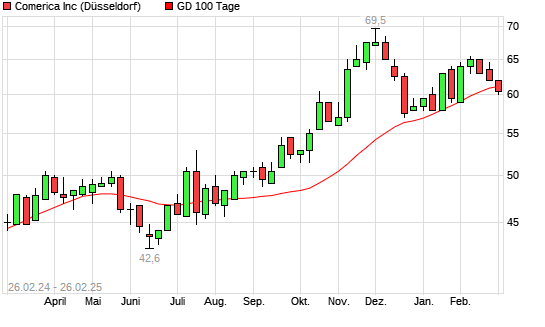 Mit dem Rücksetzer auf 61,50 EUR hat die Comerica-Aktie am 25.02.2025 die 100-Tage-Linie nach unten gekreuzt.