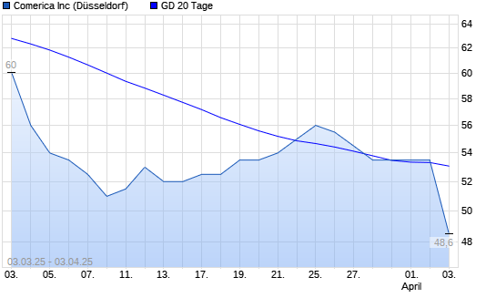 Mit dem Rücksetzer auf 53,50 EUR hat die Comerica-Aktie am 02.04.2025 die 20-Tage-Linie nach unten gekreuzt.