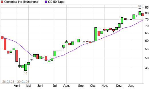 Mit dem Rücksetzer auf 77,00 EUR hat die Comerica-Aktie am 25.02.2026 die 50-Tage-Linie nach unten gekreuzt.Die Comerica-Aktie befindet sich seit dem 25.07.2025 im ...weiterlesen