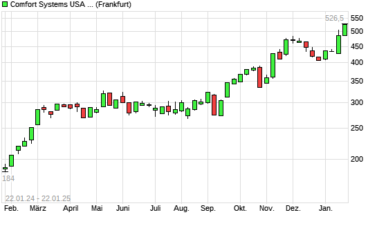 Mit dem Anstieg auf 501,50 EUR hat die Comfort Systems-Aktie (ISIN US1999081045) am 21.01.2025 ein neues All-Time-High erreicht und damit den Kurs vom 16.01.2025 eingestellt.
