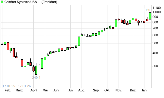 Mit dem Anstieg auf 981,00 EUR hat die Comfort Systems-Aktie (ISIN US1999081045) am 16.01.2026 ein neues All-Time-High erreicht und damit den Kurs vom 15.01.2026 eingestellt.