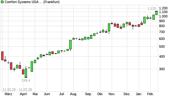 Mit dem Anstieg auf 1.095,00 EUR hat die Comfort Systems-Aktie (ISIN US1999081045) am 10.02.2026 ein neues All-Time-High erreicht und damit den Kurs vom 09.02.2026 eingestellt.