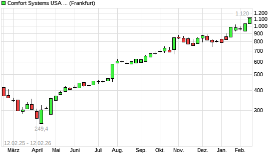 Mit dem Anstieg auf 1.120,00 EUR hat die Comfort Systems-Aktie (ISIN US1999081045) am 11.02.2026 ein neues All-Time-High erreicht und damit den Kurs vom 10.02.2026 eingestellt.