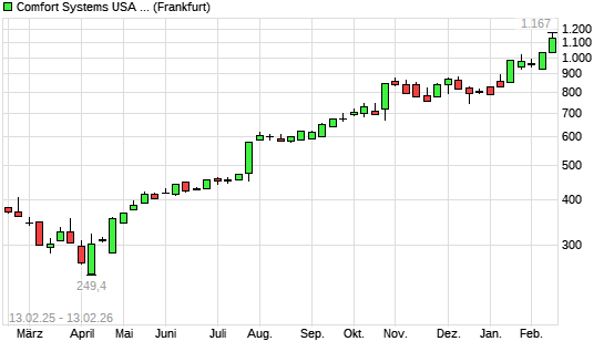 Mit dem Anstieg auf 1.156,00 EUR hat die Comfort Systems-Aktie (ISIN US1999081045) am 12.02.2026 ein neues All-Time-High erreicht und damit den Kurs vom 11.02.2026 eingestellt.