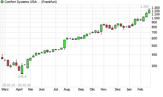 Mit dem Anstieg auf 1.168,00 EUR hat die Comfort Systems-Aktie (ISIN US1999081045) am 19.02.2026 ein neues All-Time-High erreicht und damit den Kurs vom 12.02.2026 eingestellt.