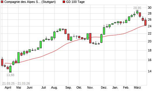 Mit dem Rücksetzer auf 24,50 EUR hat die Compangnie des Alpes-Aktie am 20.03.2026 die 100-Tage-Linie nach unten gekreuzt.