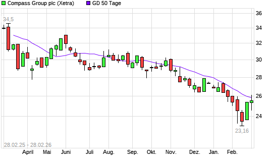 Mit dem Anstieg auf 25,89 EUR hat die Compass Group-Aktie am 27.02.2026 die 50-Tage-Linie nach oben gekreuzt.