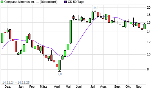 Mit dem Anstieg auf 15,40 EUR hat die Compass Minerals-Aktie am 13.11.2025 die 50-Tage-Linie nach oben gekreuzt.