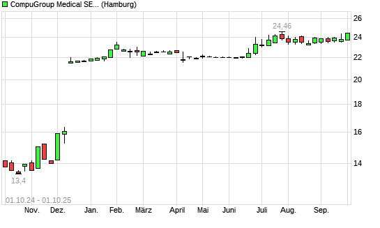Mit dem Anstieg auf 24,42 EUR hat die CompuGroup Medical-Aktie (ISIN DE000A288904) am 30.09.2025 ein neues 12-Monats-Hoch erreicht und damit den Kurs vom 25.09.2025 eingestellt.