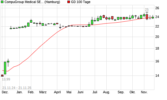 Mit dem Anstieg auf 24,20 EUR hat die CompuGroup Medical-Aktie am 20.11.2025 die 100-Tage-Linie nach oben gekreuzt.