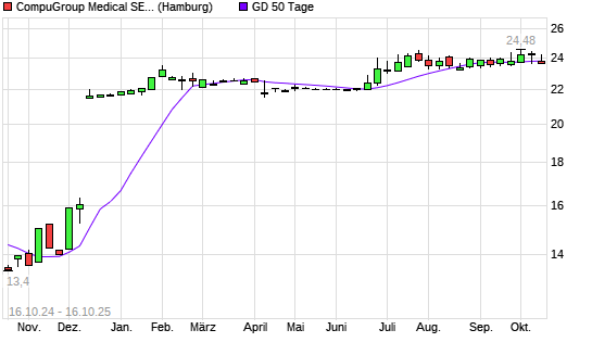 Mit dem Anstieg auf 24,00 EUR hat die CompuGroup Medical-Aktie am 15.10.2025 die 50-Tage-Linie nach oben gekreuzt.