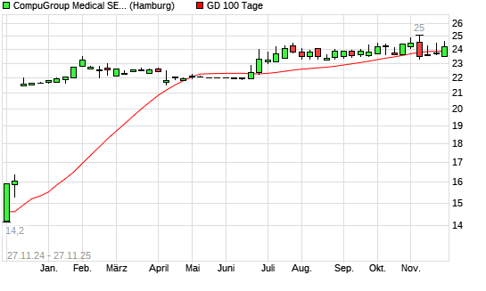Mit dem Rücksetzer auf 23,84 EUR hat die CompuGroup Medical-Aktie am 26.11.2025 die 100-Tage-Linie nach unten gekreuzt.