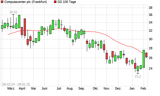 Mit dem Rücksetzer auf 26,20 EUR hat die Computacenter-Aktie am 07.02.2025 die 100-Tage-Linie nach unten gekreuzt.