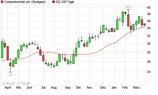 Mit dem Rücksetzer auf 34,00 EUR hat die Computacenter-Aktie am 16.03.2026 die 100-Tage-Linie nach unten gekreuzt.