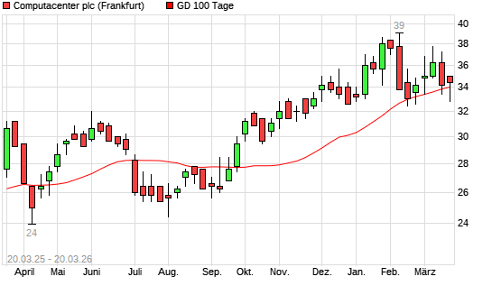 Mit dem Rücksetzer auf 33,40 EUR hat die Computacenter-Aktie am 19.03.2026 die 100-Tage-Linie nach unten gekreuzt.