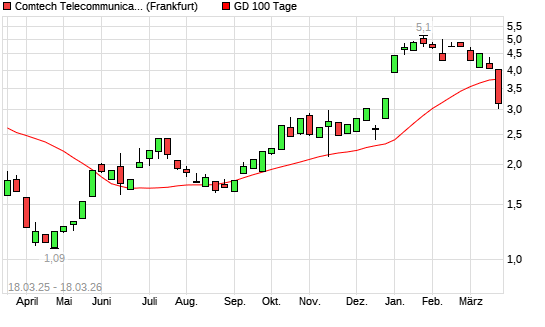 Mit dem Rücksetzer auf 3,02 EUR hat die Comtech Telecommunication-Aktie am 17.03.2026 die 100-Tage-Linie nach unten gekreuzt.